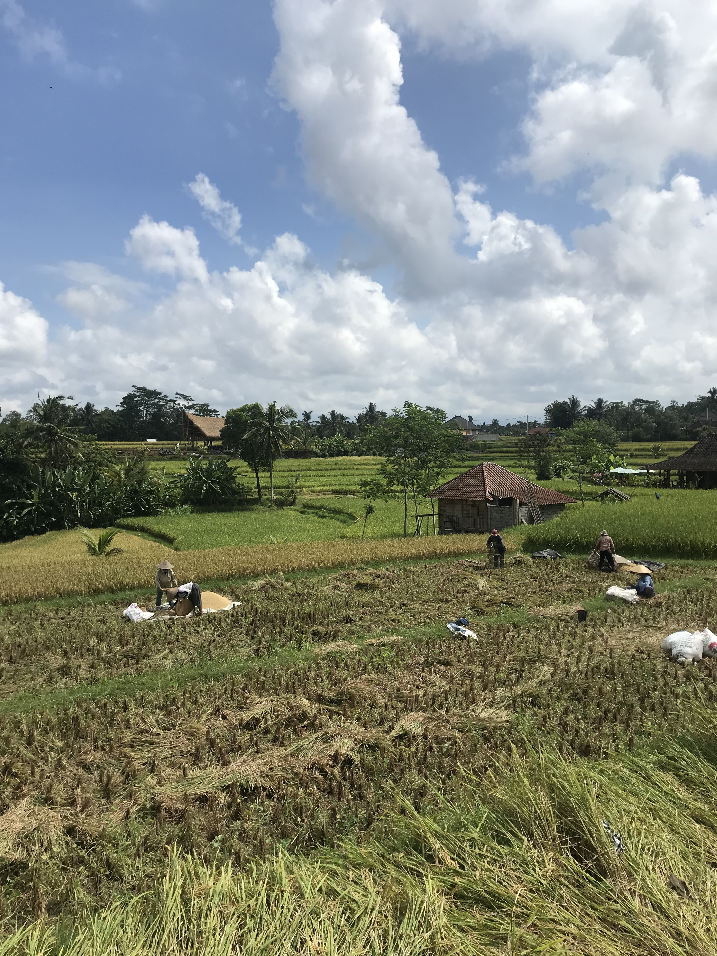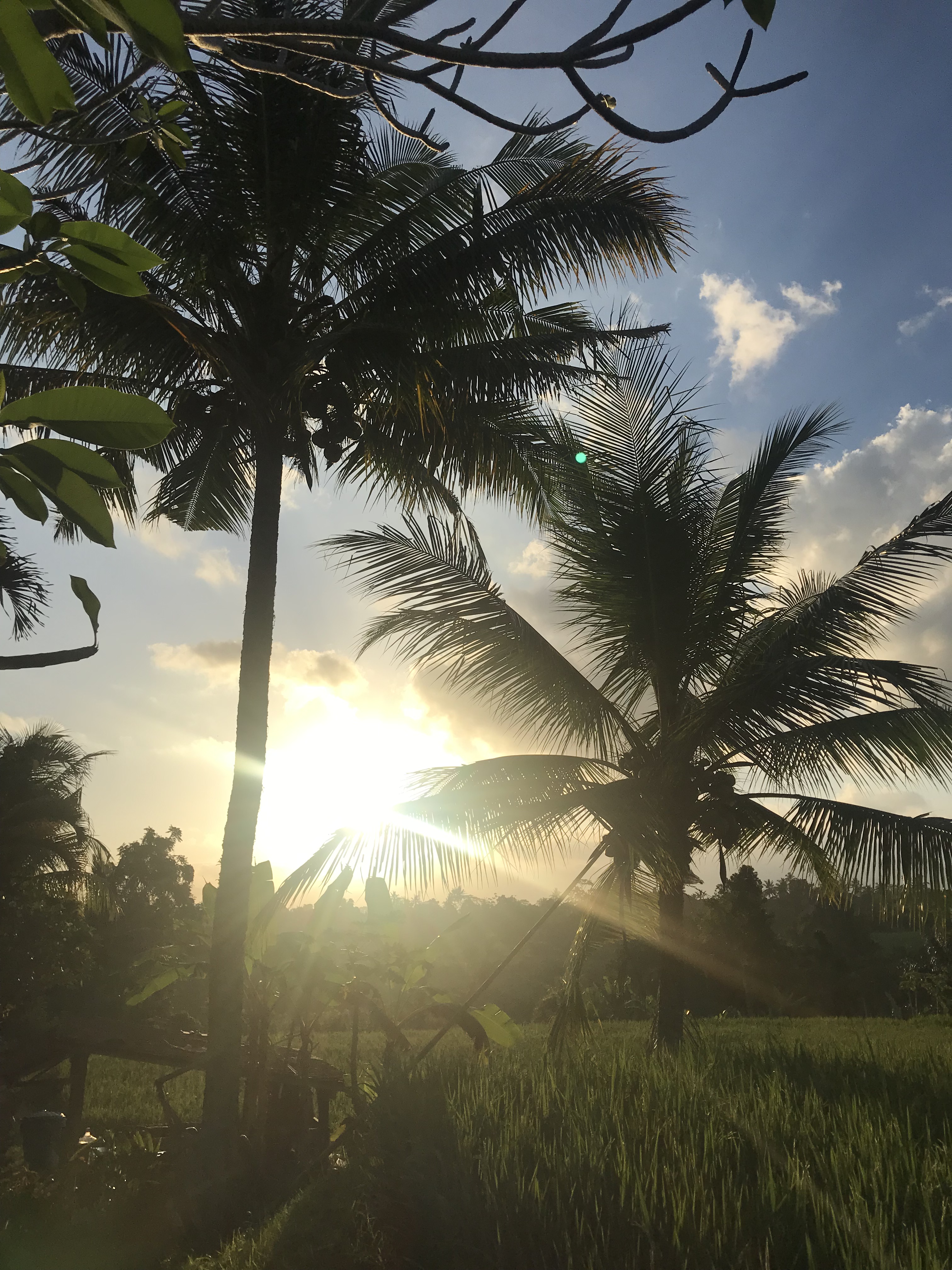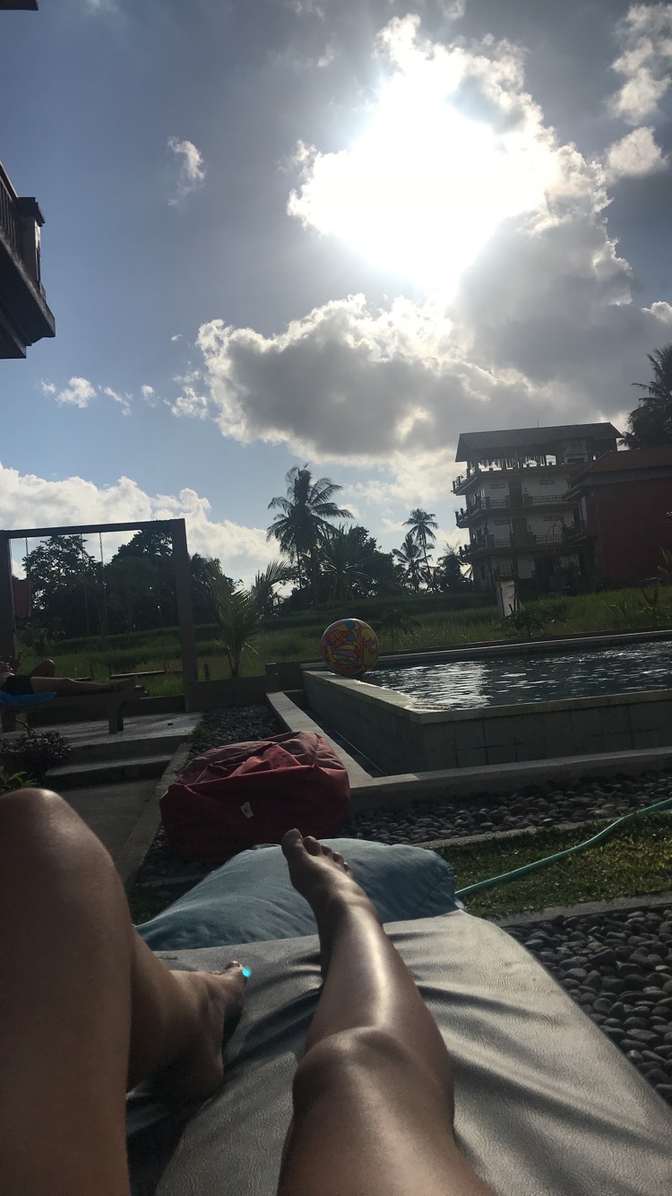 The hostel I’m staying at feels more like a resort. Yes, I do share a room with 5 other girls but there are full on lounge chairs, a swing overlooking the rice fields, palm trees everywhere, and a nice pool that’s is very refreshing on a hot day. It also offers free breakfast and has outdoor showers!