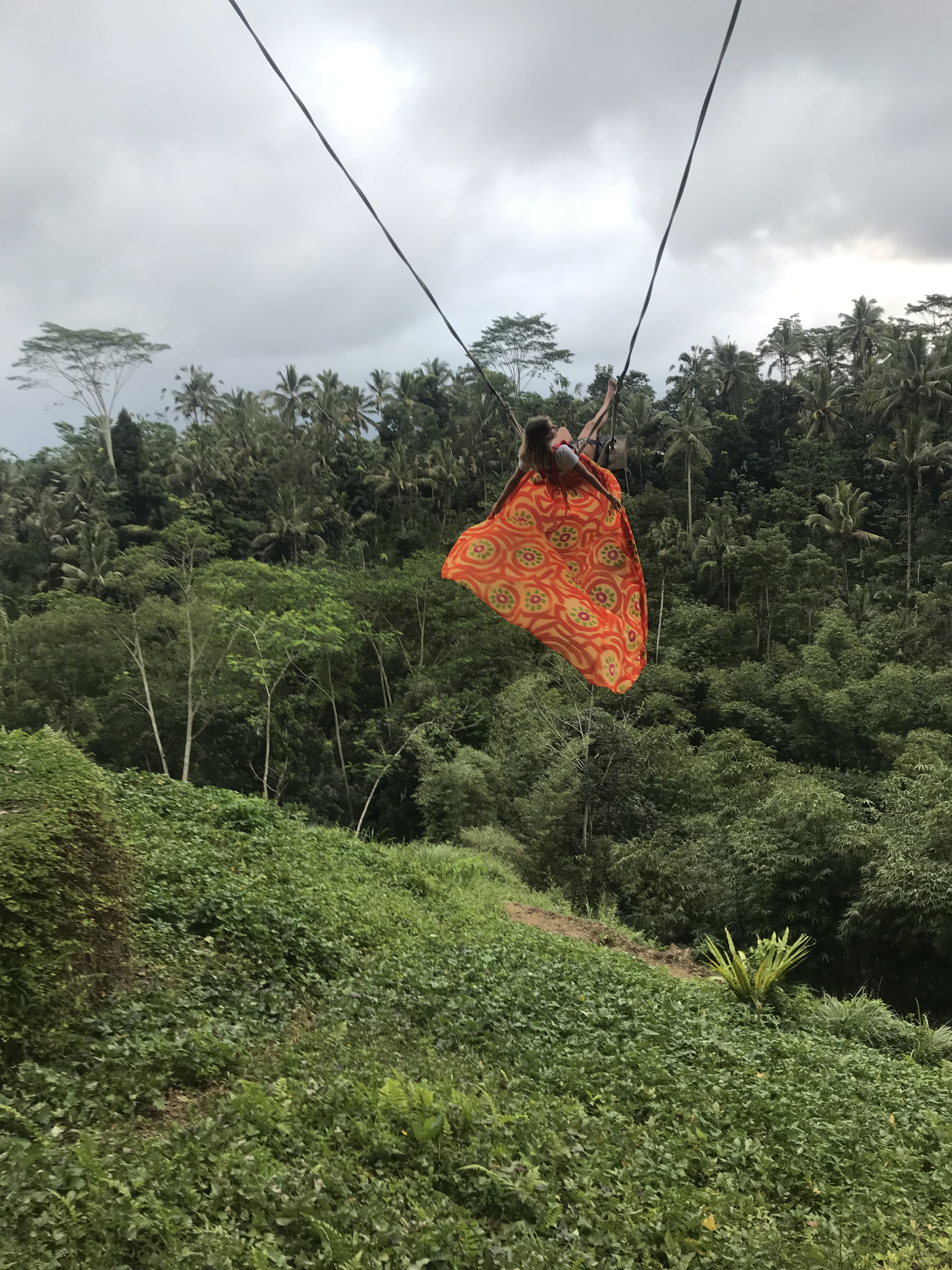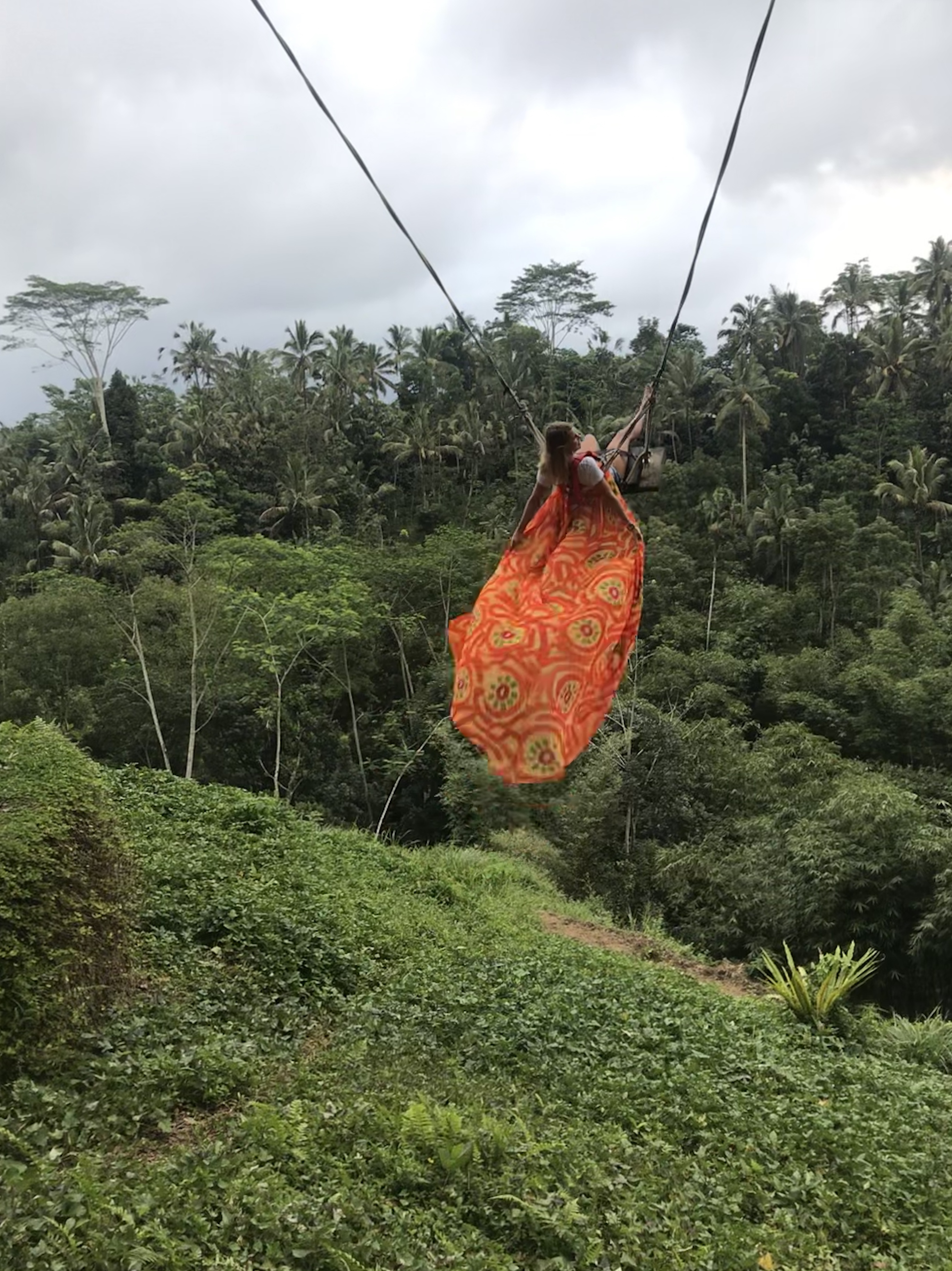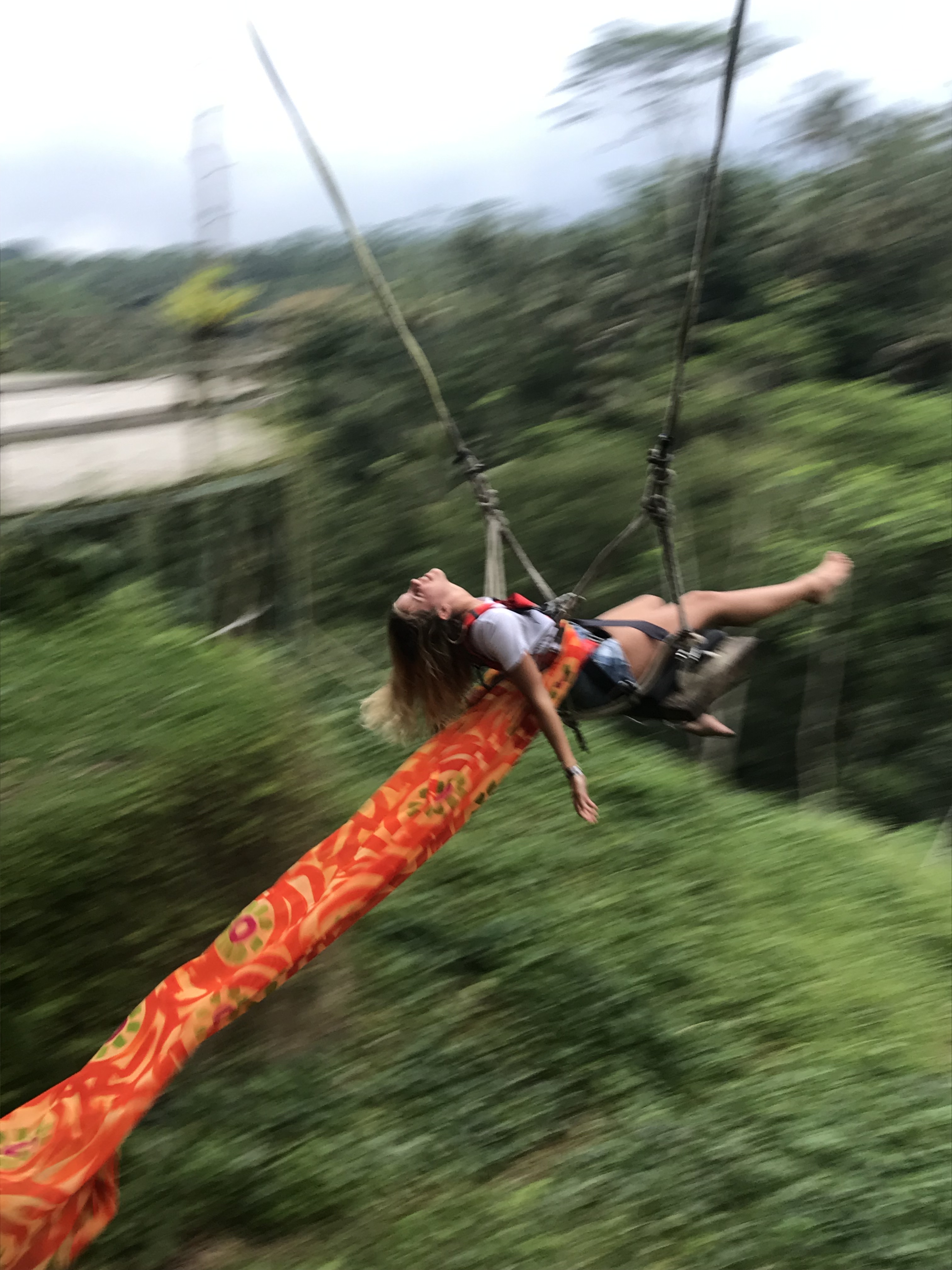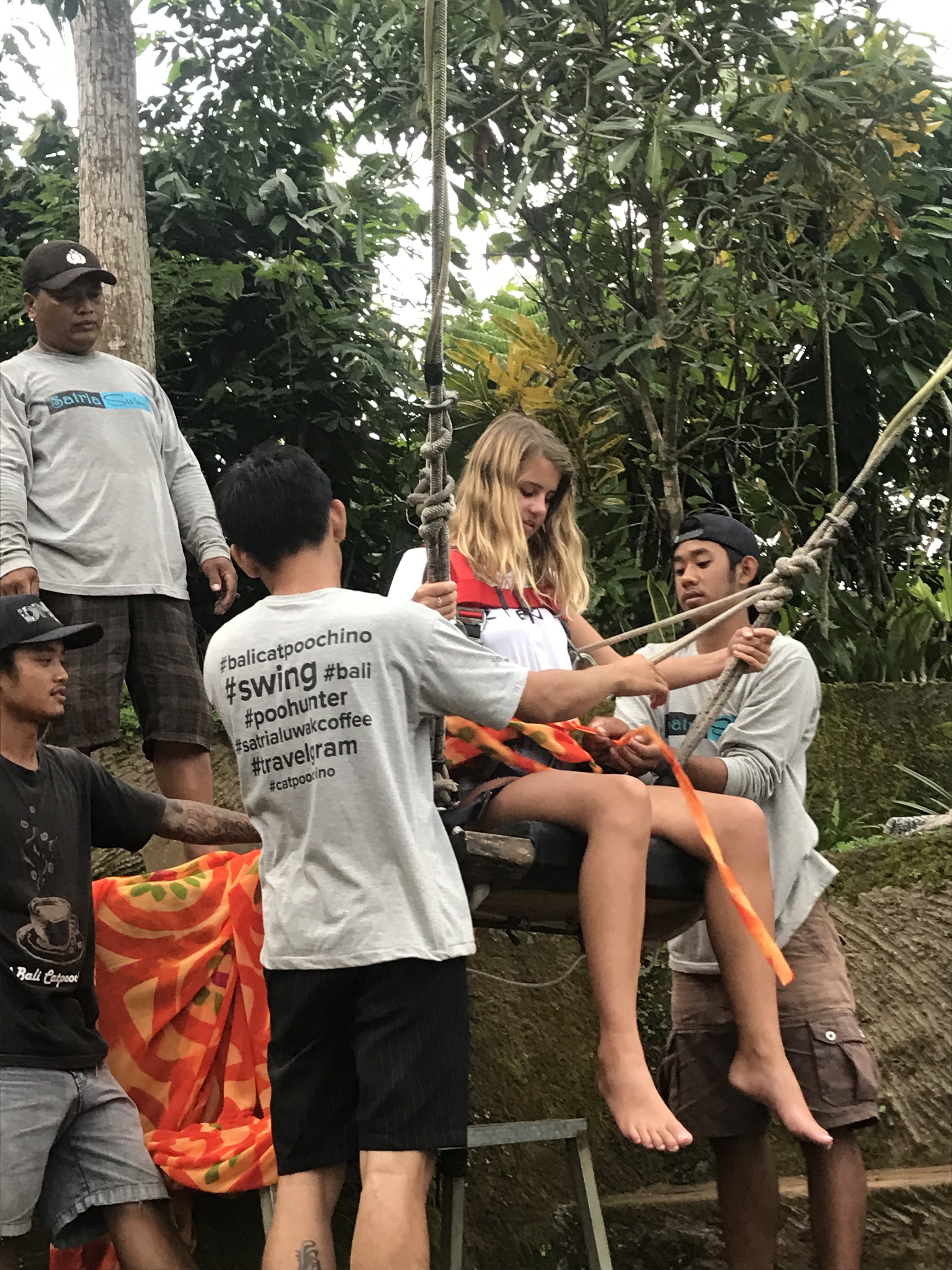 I was not expecting this part of the trip but it was still very interesting. We got a tour of the area where the pick the beans from and then how they make the coffee. They have a special type of coffee called a cat-poo-chino and yes it is made from an animal called a Luwak who eats the coffee beans from the plant and then poop em out, workers then gather the decided and wash it/in a shell the beans/prepare it into a coffee that people drink. So next time you hear of a cappuccino think cat-poo-chino aa that is what the locals do here in Bali. After the tour, we got to taste test all sorts of flavours. They had many different kinds of teas and coffees and for someone who does not normally partake in these beverages, I can say most of them Tatar’s very good. The coffee wasn’t bitter at all and the variety of teas were all very interesting. And yes we did try the Cat-Poo-CHino. After fuelling up we were on to our final part of the day…the swing.