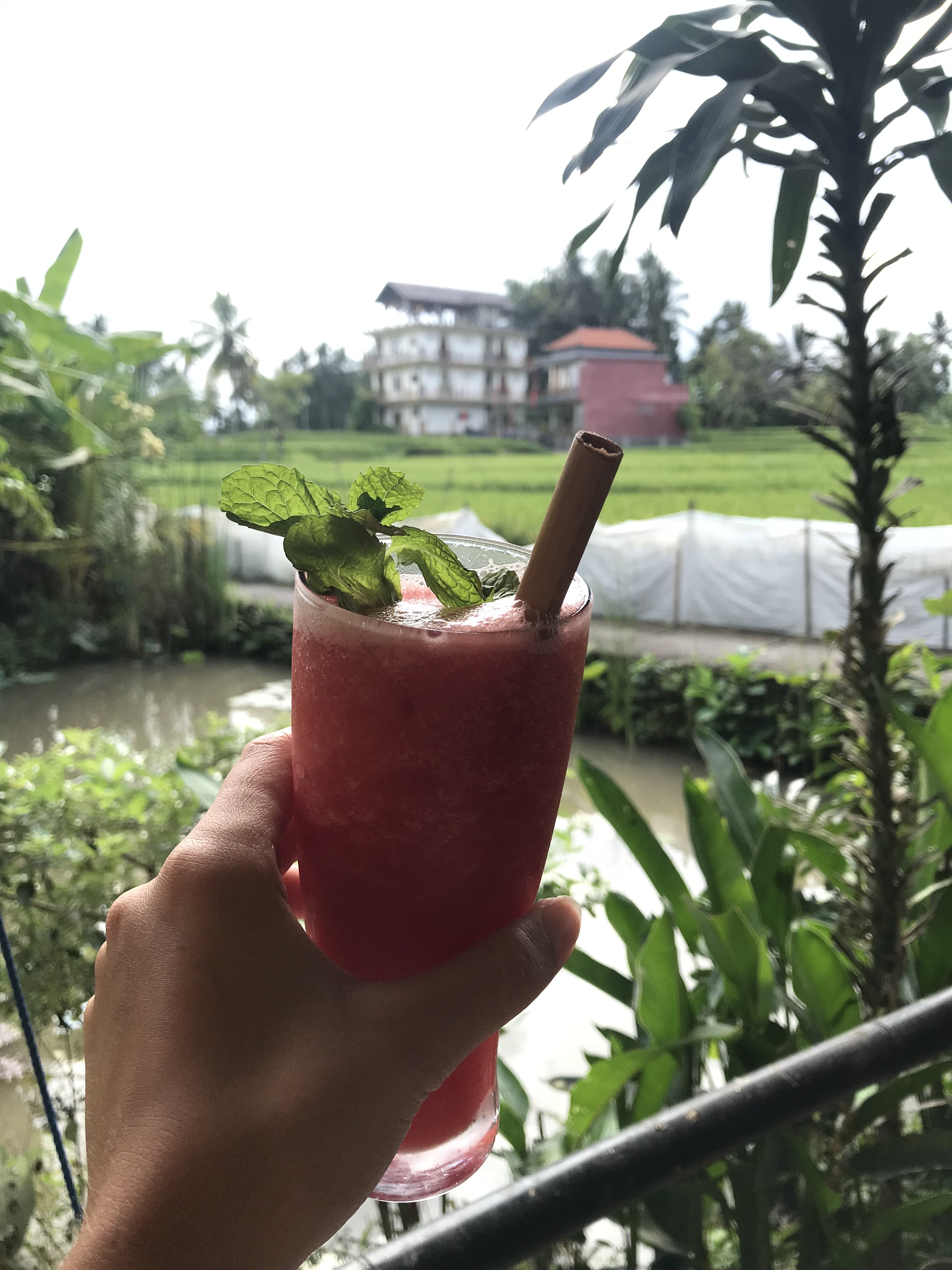 After laying in the sun for a few hours my headache still persisted on and off. Finally, I headed into town to look for some Advil and found the Indonesian version. After 30 minutes it helped immensely. I then wandered some shops and bought my favourite souvenir very flowy Bali style elephant pants! I then went back tot the hostel and watched the sunset while reading by the pool. Finally, I was hungry so I put my new pants on and headed off to find some food. I found this very yummy smoothie place and the smoothie was only $2.5! With a drink in hand, I headed back to the hostel to relax for the night as it had been a long day.